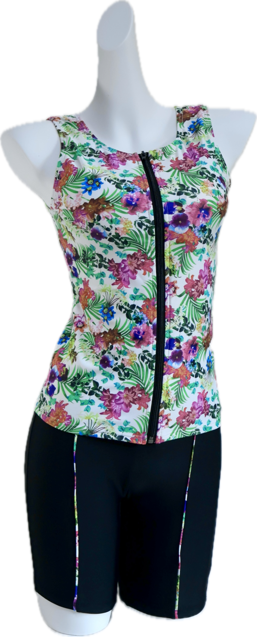 華やかなフラワー&リーフプリントが目を引く、機能性に優れたセパレートタイプの水着です。フロントジップ仕様にすることで、濡れた状態でも着脱がスムーズ。